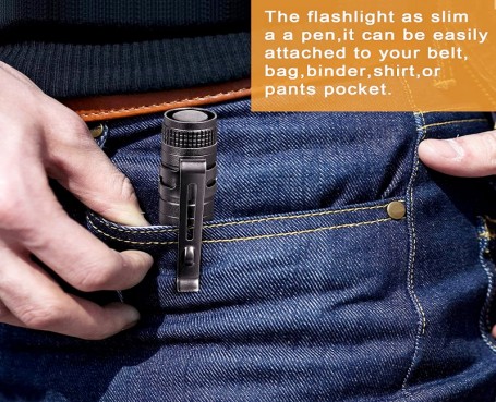 Clip wearing method of pocket flashlight and 1100 lumen CREE lamp beads.